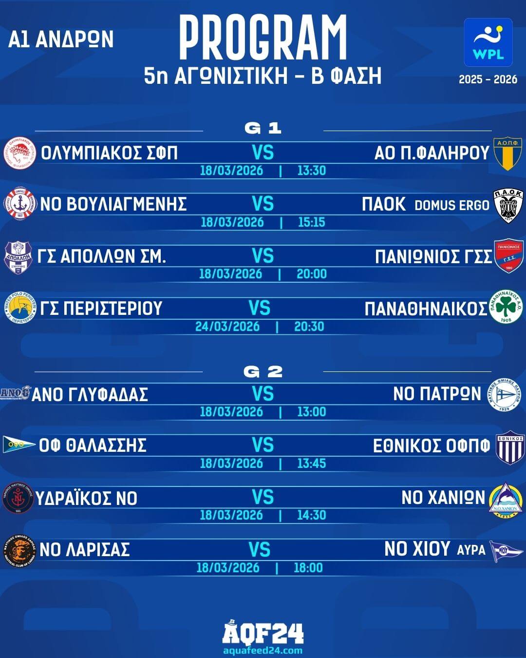 Σε δύο ημέρες θα ολοκληρωθεί η 5η αγωνιστική της Β΄ Φάσης στη Waterpolo League, σε αμφότερους τους ομίλους, με επτά αγώνες να είναι προγραμματισμένοι για την Τετάρτη (18/3). Σημειώνεται πως ο αγώνας ανάμεσα στο Περιστέρι και τον Παναθηναϊκό θα διεξαχθεί περίπου μία εβδομάδα αργότερα (24/3), λόγω των υποχρεώσεων που έχουν οι «πράσινοι» στο Euro Cup Ανδρών.
